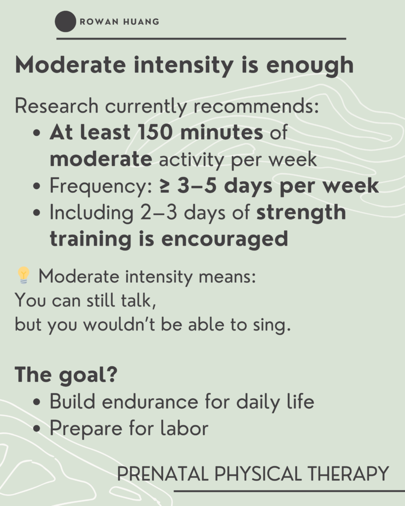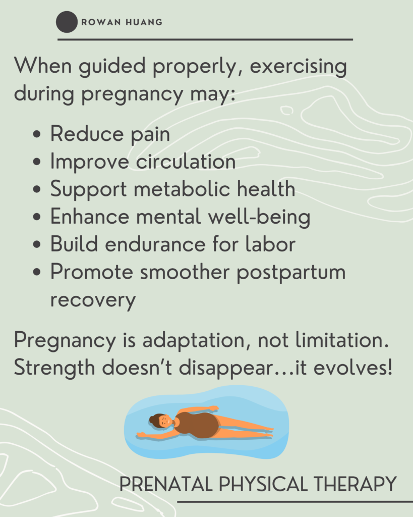 Current research supports regular physical activity throughout pregnancy. In fact, avoiding movement altogether may contribute to increased discomfort, reduced endurance, and slower recovery postpartum.